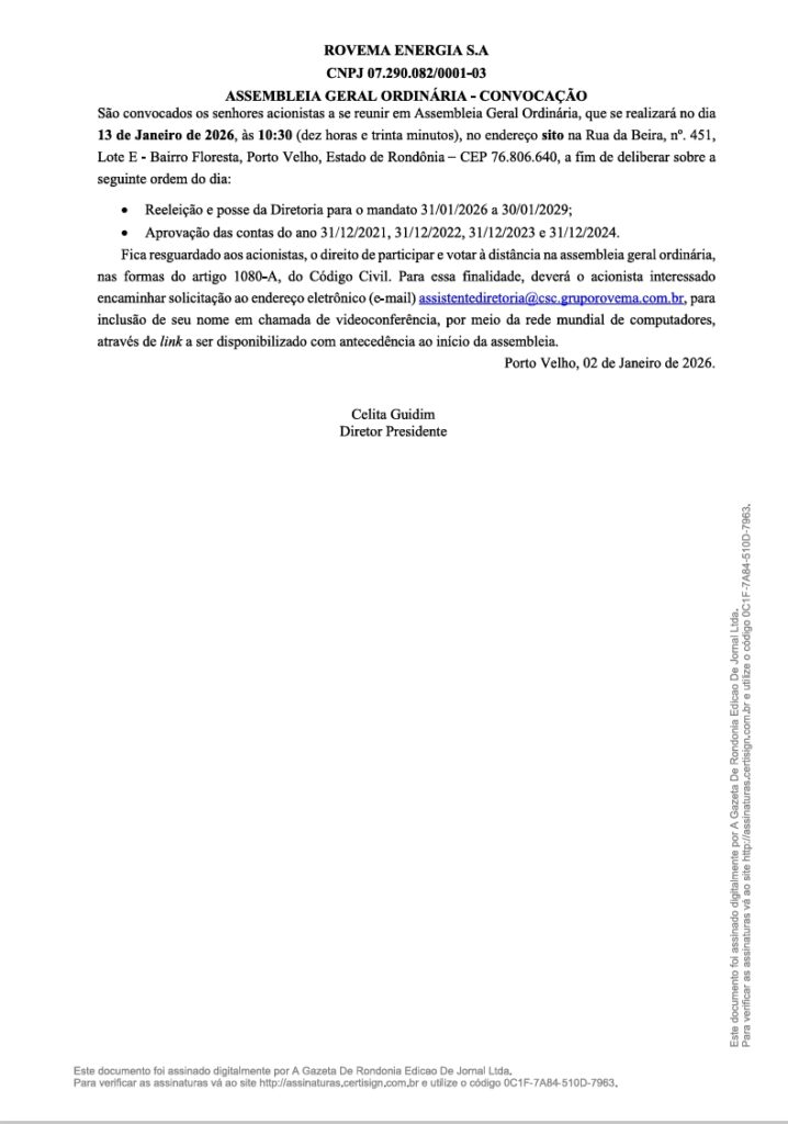 Rovema Energia S. A. EDITAL DE CONVOCAÇÃO ASSEBLEIA GERAL ORDINÁRIA Por Diretor Chefe 5 de janeiro de 2026 às 09h22
