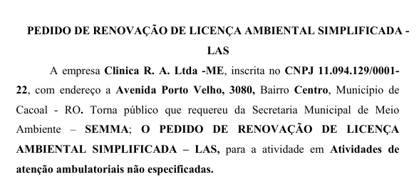 PEDIDO DE RENOVAÇÃO DE LICENÇA AMBIENTAL SIMPLIFICADA – CLINICA R. A. Ltda -ME Por Diretor Chefe 25 de agosto de 2025 às 15h47