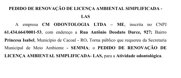 PEDIDO DE RENOVAÇÃO DE LICENÇA AMBIENTAL SIMPLIFICADA – LAS CM ODONTOLOGIA Por Diretor Chefe 25 de agosto de 2025 às 15h45