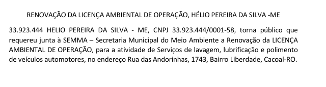 RENOVAÇÃO DA LICENÇA AMBIENTAL DE OPERAÇÃO, HÉLIO PEREIRA DA SILVA -ME Por Diretor Chefe 25 de agosto de 2025 às 16h22