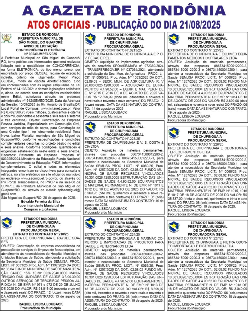 A GAZETA DE RONDÔNIA ATOS OFICIAIS PUBLICAÇÃO DOS DIAS 23, 24 E 25/08/2025 Por Diretor Chefe 22 de agosto de 2025 às 17h40