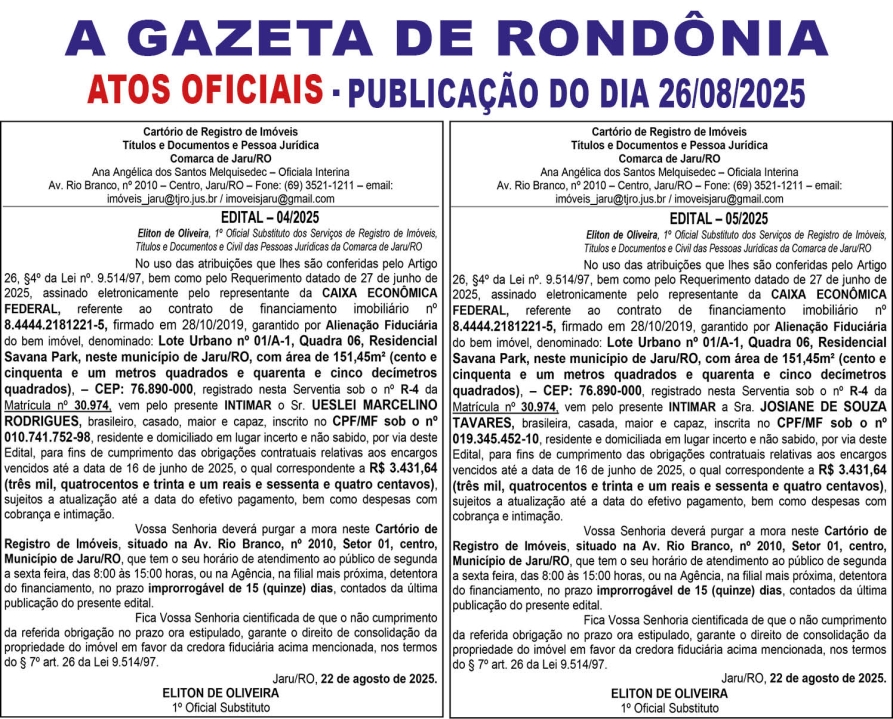 A GAZETA DE RONDÔNIA ATOS OFICIAIS PUBLICAÇÃO DO DIA 26/08/2025 Por Diretor Chefe 25 de agosto de 2025 às 17h17