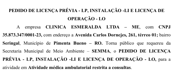 PEDIDO DE LICENÇA PRÉVIA – LP, INSTALAÇÃO -LI E LICENÇA DE OPERAÇÃO – LO CLINICA ESMERALDA LTDA Por Diretor Chefe 8 de agosto de 2025 às 12h50