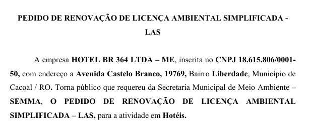 PEDIDO DE RENOVAÇÃO DE LICENÇA AMBIENTAL SIMPLIFICADA – LAS – HOTEL BR 364 LTDA – ME Por Diretor Chefe 15 de agosto de 2025 às 09h12
