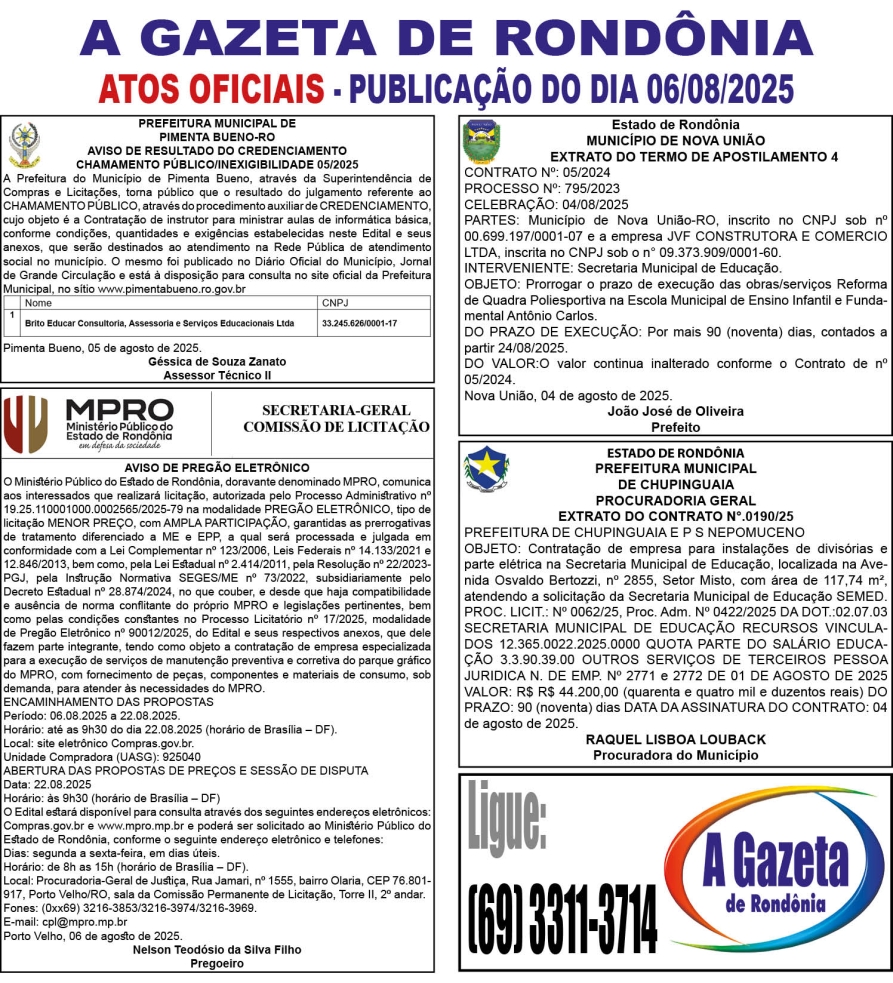 A GAZETA DE RONDÔNIA ATOS OFICIAIS PUBLICAÇÃO DO DIA 06/08/2025 Por Diretor Chefe 5 de agosto de 2025 às 17h21