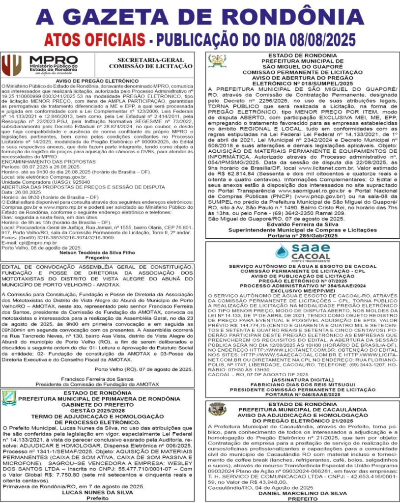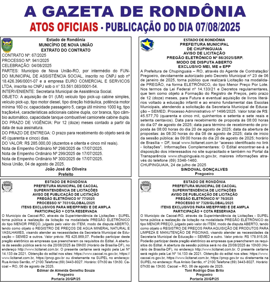 A GAZETA DE RONDÔNIA ATOS OFICIAIS PUBLICAÇÃO DO DIA 07/08/2025 Por Diretor Chefe 6 de agosto de 2025 às 17h34