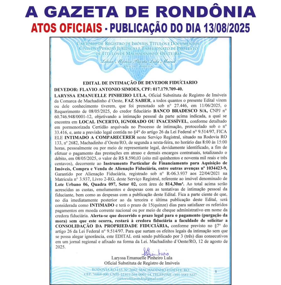 A GAZETA DE RONDÔNIA ATOS OFICIAIS PUBLICAÇÃO DO DIA 13/08/2025 Por Diretor Chefe 12 de agosto de 2025 às 17h52