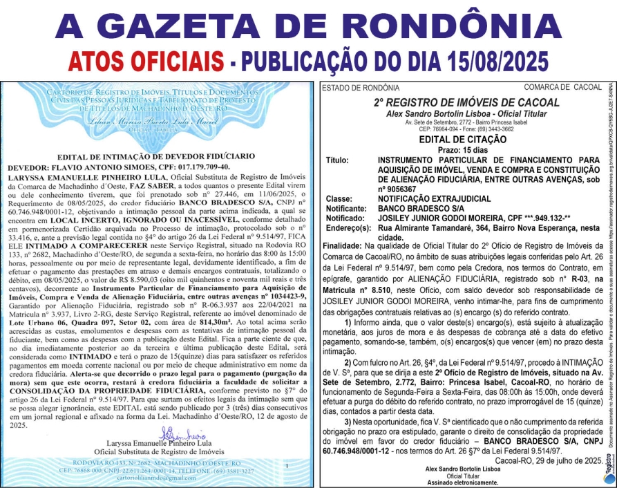 A GAZETA DE RONDÔNIA ATOS OFICIAIS PUBLICAÇÃO DO DIA 15/08/2025 Por Diretor Chefe 15 de agosto de 2025 às 06h51