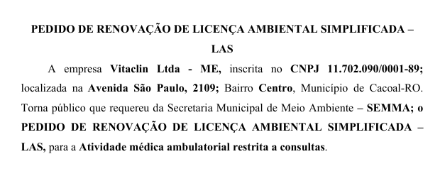 PEDIDO DE RENOVAÇÃO DE LICENÇA AMBIENTAL SIMPLIFICADA – LAS VITACLIN LTDA ME Por Diretor Chefe 29 de julho de 2025 às 11h08
