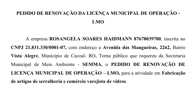 PEDIDO DE RENOVAÇÃO DA LICENÇA MUNICIPAL DE OPERAÇÃO – LMO – ROSANGELA SOARES HAIDMANN Por Diretor Chefe 28 de julho de 2025 às 16h16