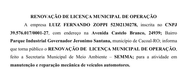 PEDIDO DE RENOVAÇÃO DE LICENÇA MUNICIPAL DE OPERAÇÃO – LUIZ FERNANDO ZOPPI Por Diretor Chefe 31 de julho de 2025 às 15h52