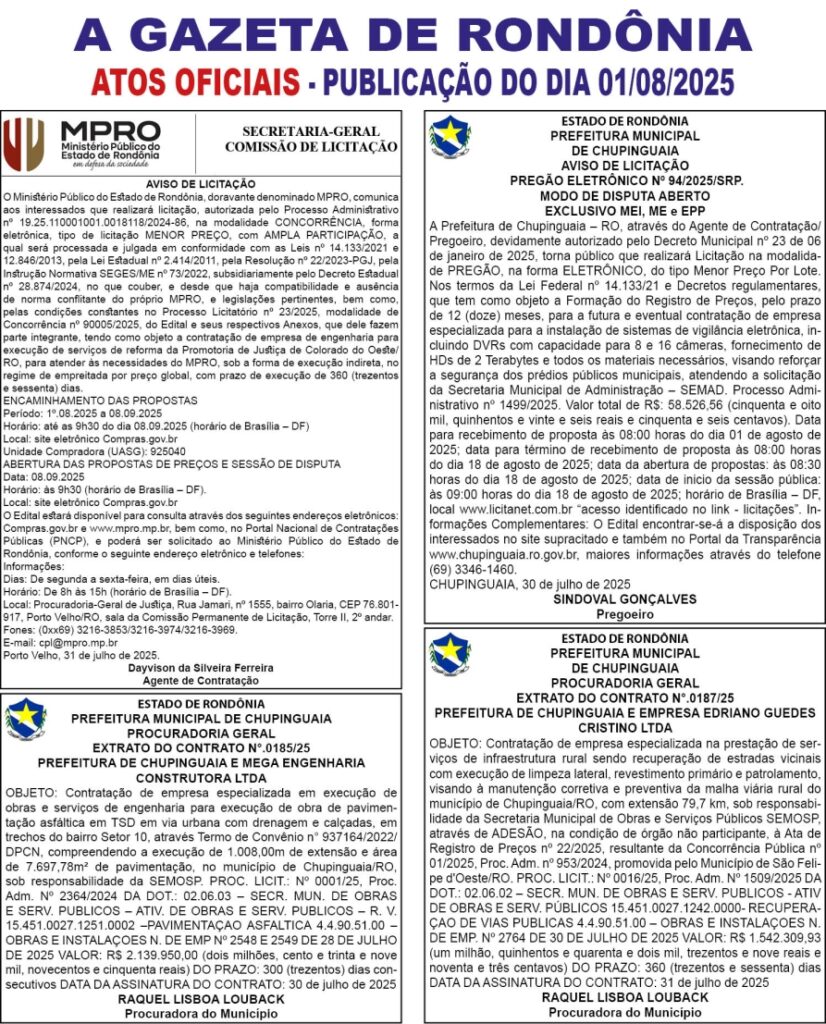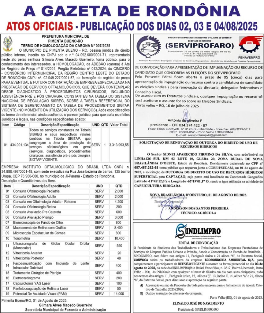 A GAZETA DE RONDÔNIA ATOS OFICIAIS PUBLICAÇÃO DOS DIAS 02, 03 E 04/08/2025 Por Diretor Chefe 1 de agosto de 2025 às 18h16