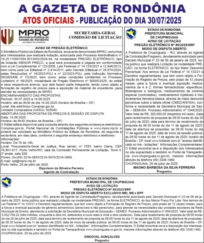 A GAZETA DE RONDÔNIA ATOS OFICIAIS PUBLICAÇÃO DO DIA 30/07/2025 Por Diretor Chefe 29 de julho de 2025 às 17h48
