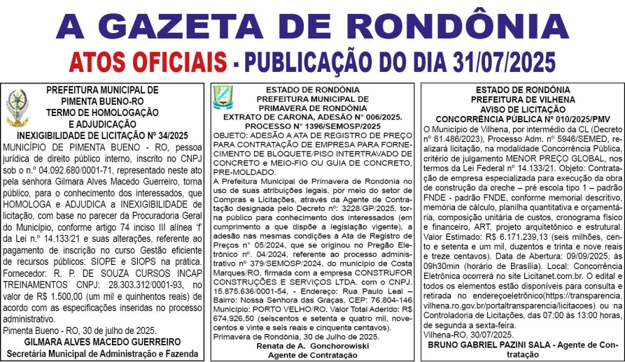 A GAZETA DE RONDÔNIA ATOS OFICIAIS PUBLICAÇÃO DO DIA 31/07/2025 Por Diretor Chefe 30 de julho de 2025 às 17h47