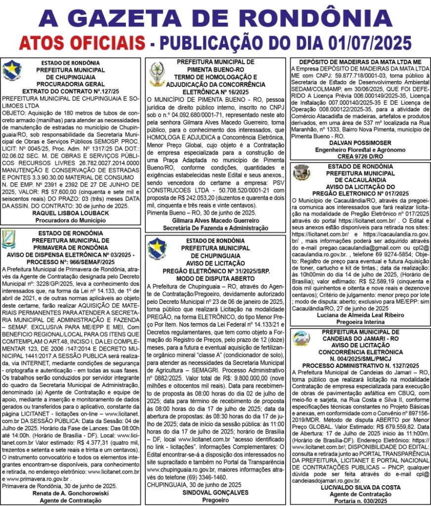 A GAZETA DE RONDÔNIA ATOS OFICIAIS PUBLICAÇÃO DO DIA 01/07/2025 Por Diretor Chefe 30 de junho de 2025 às 17h38