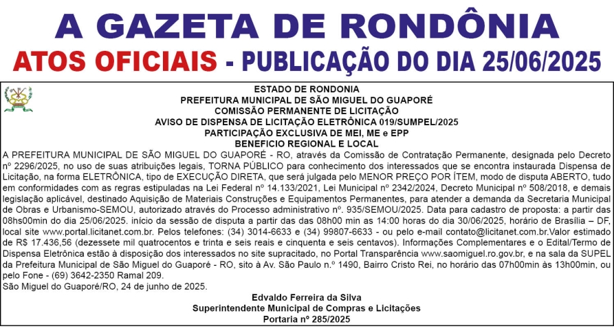 A GAZETA DE RONDÔNIA ATOS OFICIAIS PUBLICAÇÃO DO DIA 25/06/2025 Por Diretor Chefe 24 de junho de 2025 às 17h24