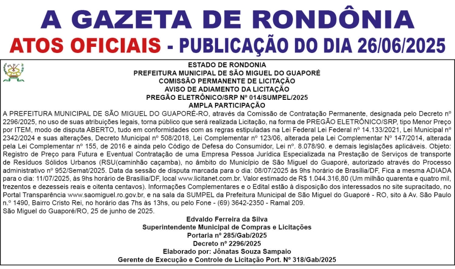 A GAZETA DE RONDÔNIA ATOS OFICIAIS PUBLICAÇÃO DO DIA 26/06/2025 Por Diretor Chefe 25 de junho de 2025 às 17h44