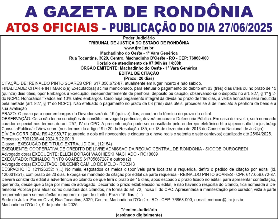 A GAZETA DE RONDÔNIA ATOS OFICIAIS PUBLICAÇÃO DO DIA 27/06/2025 Por Diretor Chefe 26 de junho de 2025 às 17h40