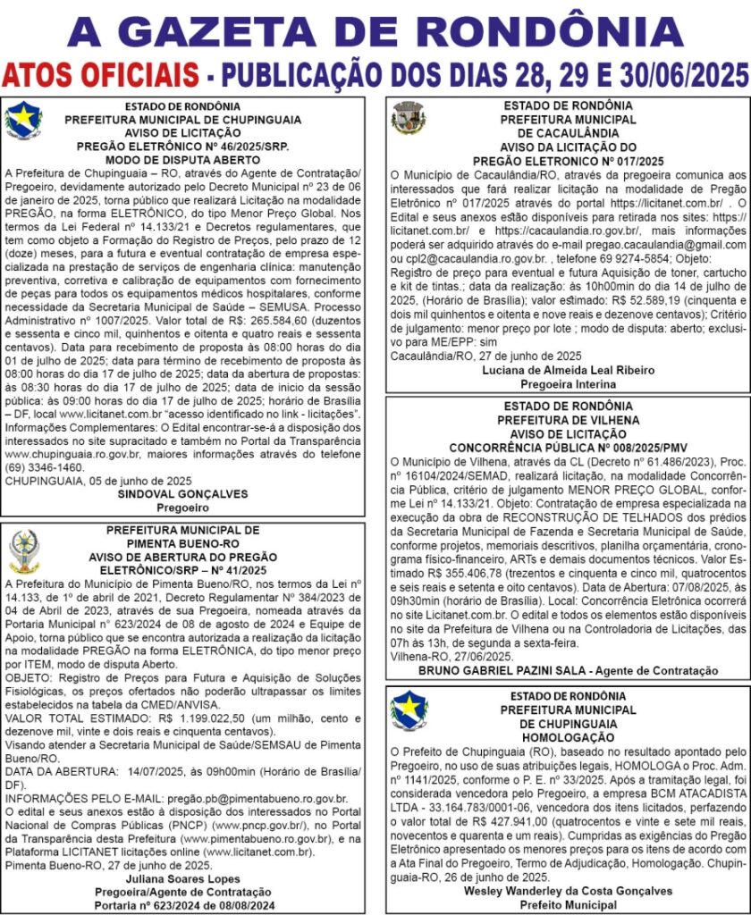 A GAZETA DE RONDÔNIA ATOS OFICIAIS PUBLICAÇÃO DO DIAS 28, 29 E 30/06/2025 Por Diretor Chefe 27 de junho de 2025 às 17h48