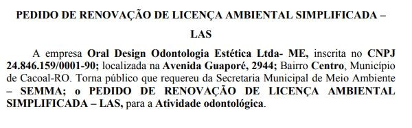 PEDIDO DE RENOVAÇÃO DE LICENÇA AMBIENTAL SIMPLIFICADA – LAS ORAL DESIGN Por Diretor Chefe 4 de julho de 2025 às 15h26