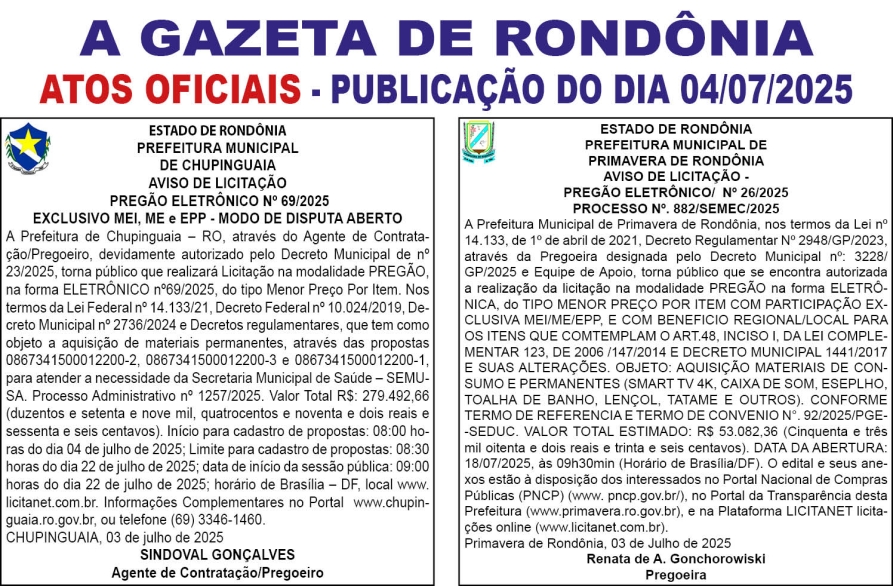 A GAZETA DE RONDÔNIA ATOS OFICIAIS PUBLICAÇÃO DOS DIAS 05, 06 E 07/07/2025 Por Diretor Chefe 4 de julho de 2025 às 18h11