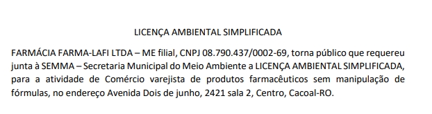 Licença Ambiental Simplificado Farmácia Farma-Lafi Ltda Por Diretor Chefe 10 de junho de 2025 às 10h34