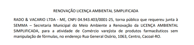 Renovação de licença Ambiental Simplificada Rado & Vacario Ltda ME Por Diretor Chefe 10 de junho de 2025 às 10h32