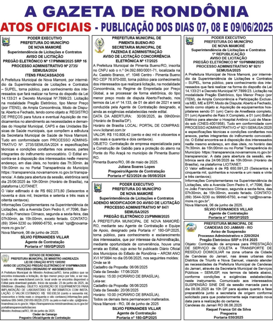 A GAZETA DE RONDÔNIA ATOS OFICIAIS PUBLICAÇÃO DOS DIAS 07, 08 E 09/06/2025 Por Diretor Chefe 6 de junho de 2025 às 17h46