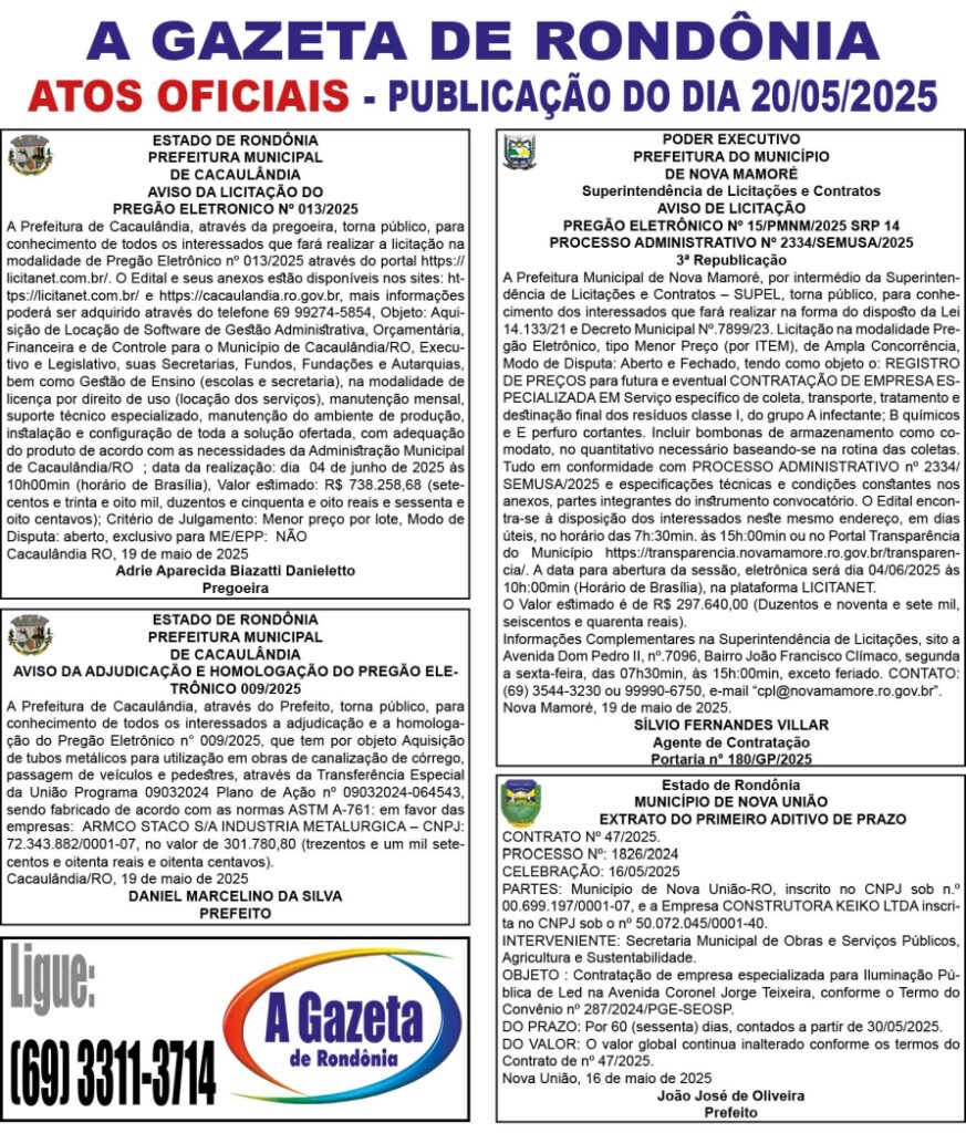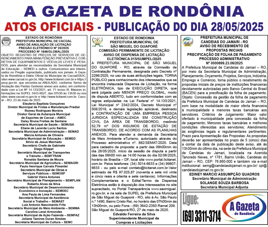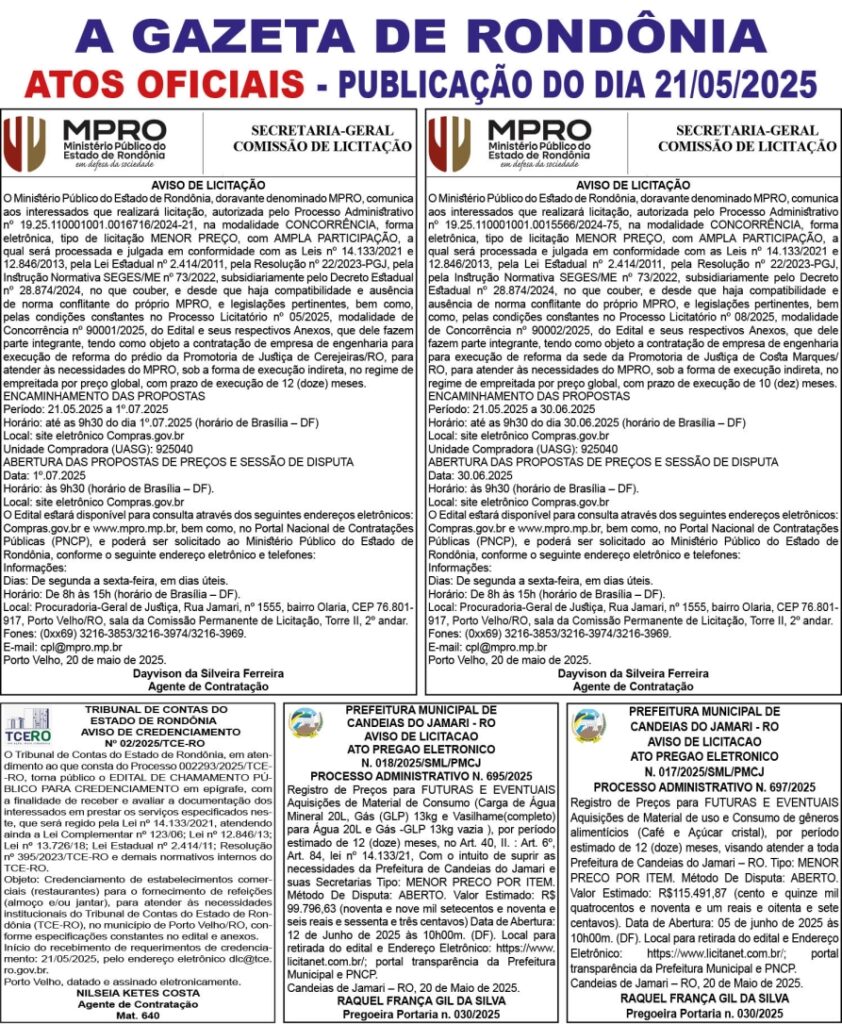 A GAZETA DE RONDÔNIA ATOS OFICIAIS PUBLICAÇÃO DOS DIAS 17, 18 E 19/05/2025 Por Diretor Chefe 16 de maio de 2025 às 17h36