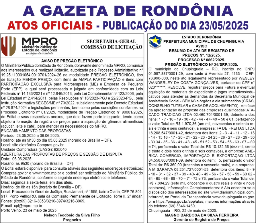 A GAZETA DE RONDÔNIA ATOS OFICIAIS PUBLICAÇÃO DOS DIAS 24, 25 E 26/05/2025 Por Diretor Chefe 23 de maio de 2025 às 17h18
