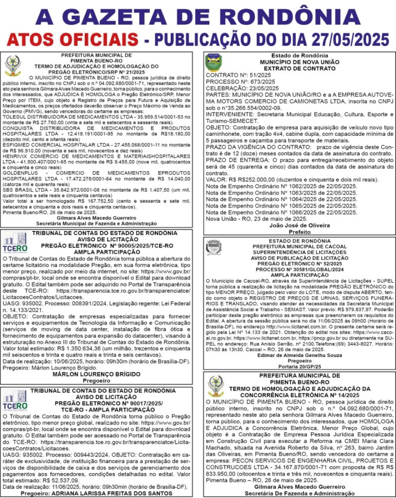 A GAZETA DE RONDÔNIA ATOS OFICIAIS PUBLICAÇÃO DO DIA 27/05/2025 Por Diretor Chefe 26 de maio de 2025 às 17h26