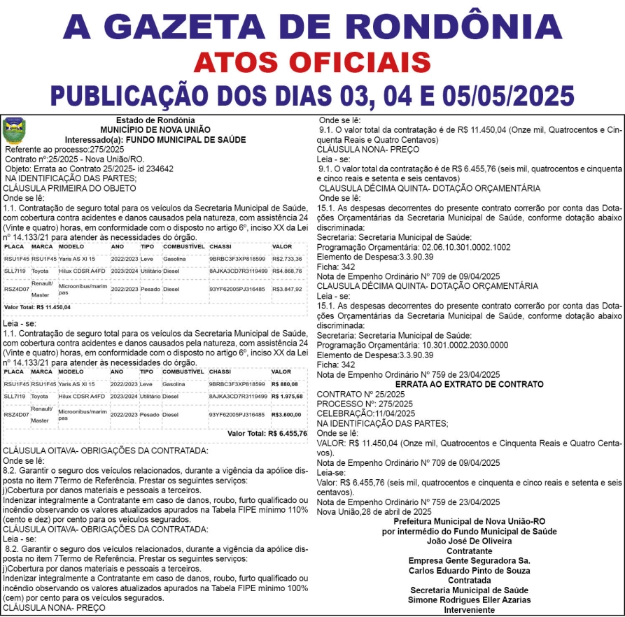A GAZETA DE RONDÔNIA ATOS OFICIAIS PUBLICAÇÃO DOS DIAS 03, 04 E 05/05/2025 Por Diretor Chefe 2 de maio de 2025 às 17h55