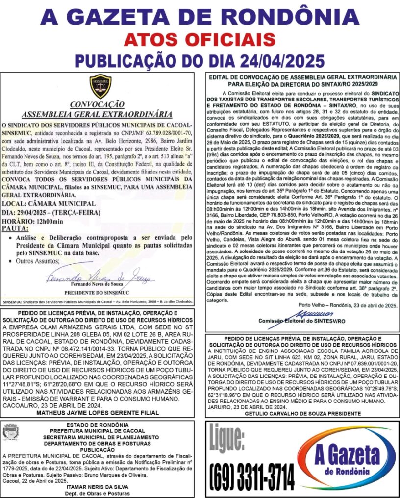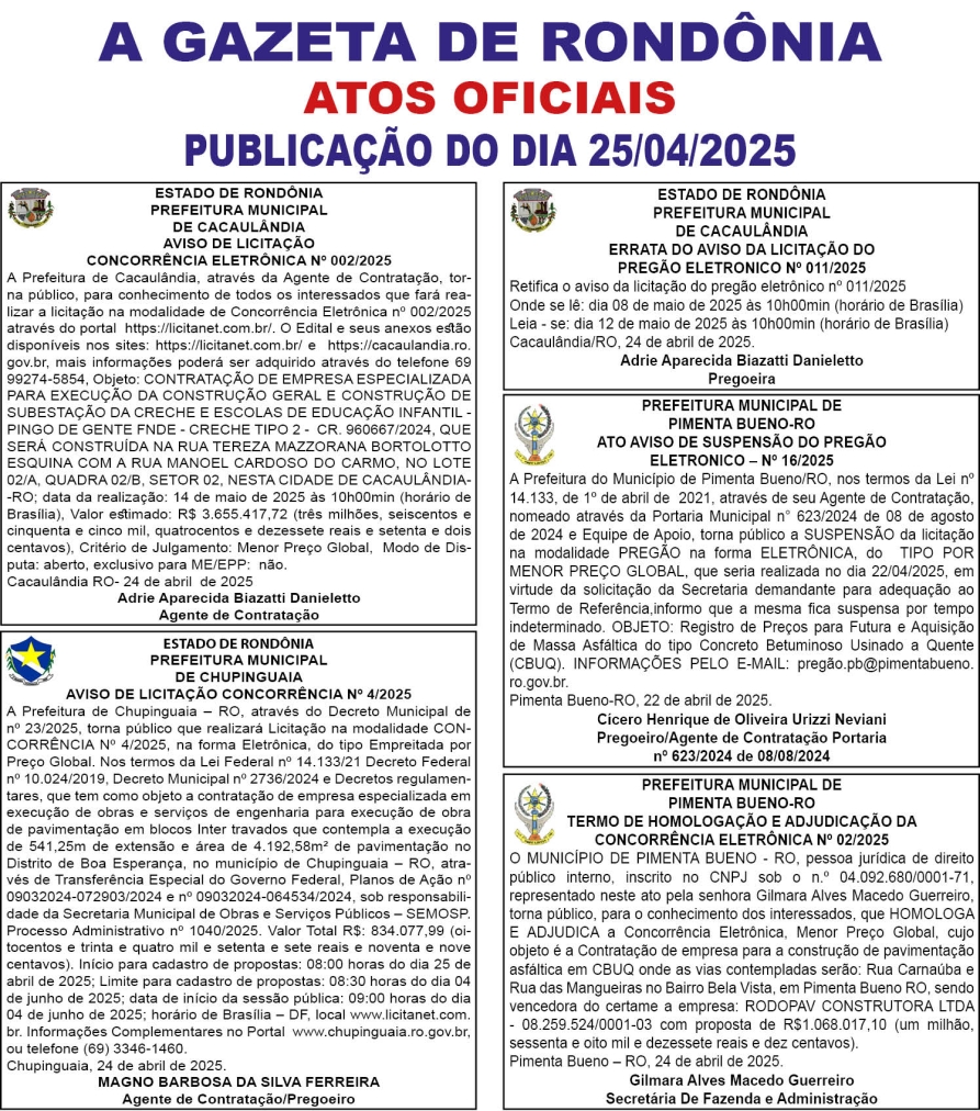 A GAZETA DE RONDÔNIA ATOS OFICIAIS PUBLICAÇÃO DO DIA 24/04/2025 Por Diretor Chefe 23 de abril de 2025 às 17h44