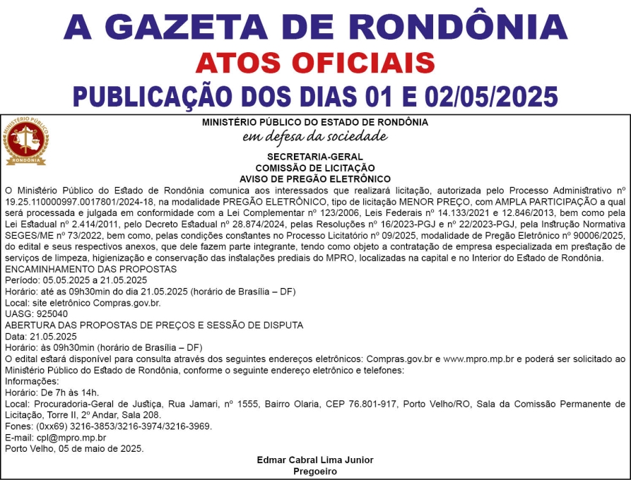 A GAZETA DE RONDÔNIA ATOS OFICIAIS PUBLICAÇÃO DOS DIAS 01 E 02/05/2025 Por Diretor Chefe 30 de abril de 2025 às 17h53
