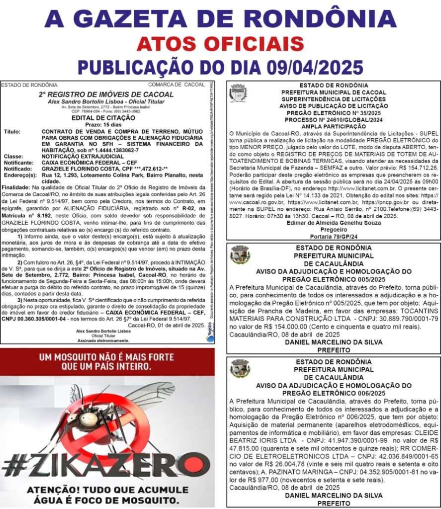 A GAZETA DE RONDÔNIA ATOS OFICIAIS PUBLICAÇÃO DO DIA 09/04/2025 Por Diretor Chefe 9 de abril de 2025 às 00h12