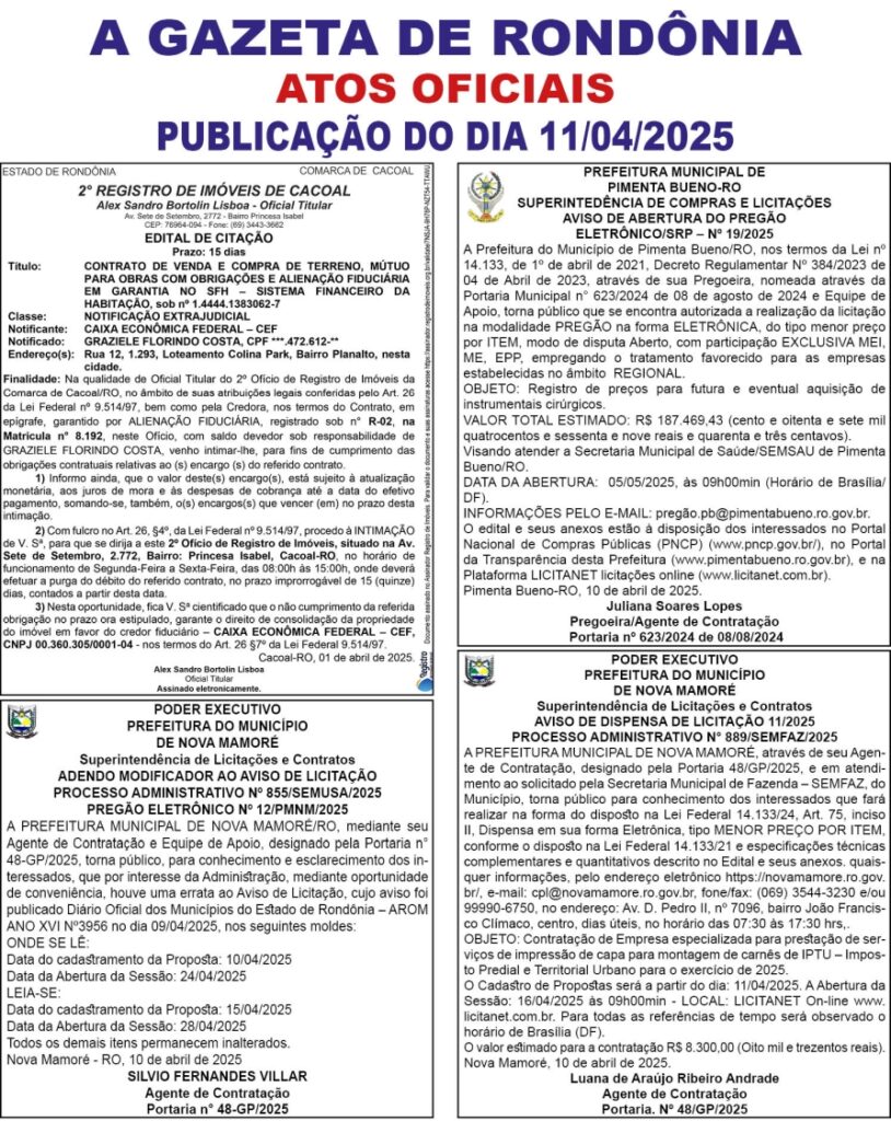 A GAZETA DE RONDÔNIA ATOS OFICIAIS PUBLICAÇÃO DO DIA 11/04/2025 Por Diretor Chefe 10 de abril de 2025 às 17h42