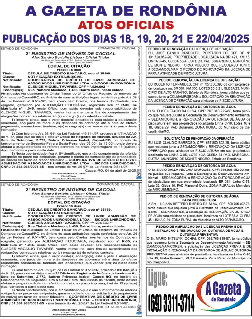 A GAZETA DE RONDÔNIA ATOS OFICIAIS PUBLICAÇÃO DOS DIAS 18, 19, 20, 21 E 22/04/2025 Por Diretor Chefe 17 de abril de 2025 às 17h47