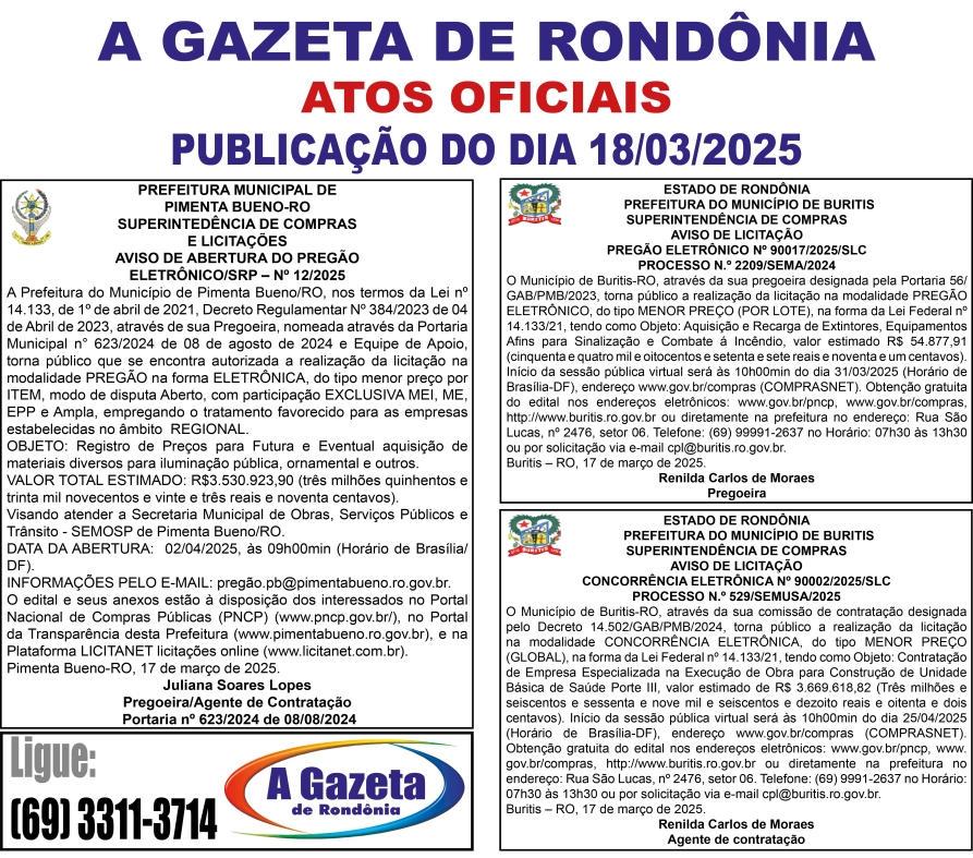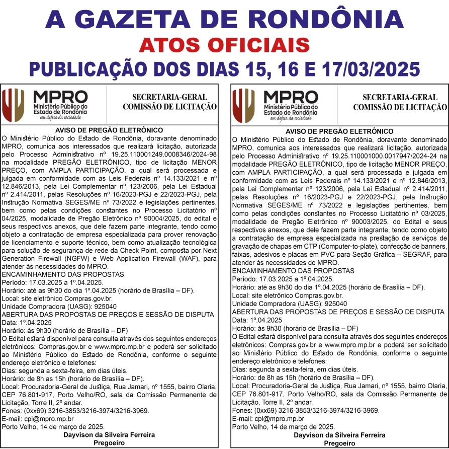 A GAZETA DE RONDÔNIA ATOS OFICIAIS PUBLICAÇÃO DOS DIAS 15, 16 E 17/03/2025 Por Diretor Chefe 14 de março de 2025 às 16h38