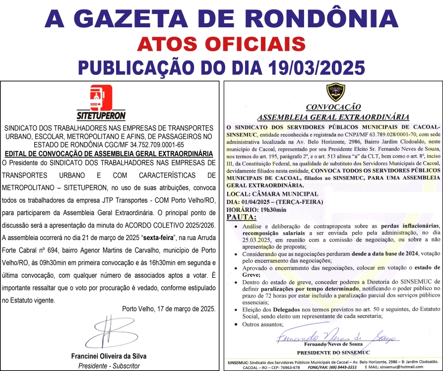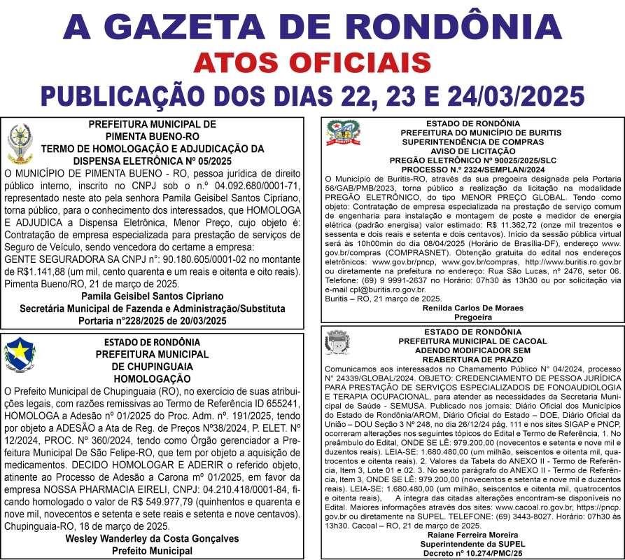 A GAZETA DE RONDÔNIA ATOS OFICIAIS PUBLICAÇÃO DOS DIAS 22, 23 E 24/03/2025 Por Diretor Chefe 21 de março de 2025 às 17h17