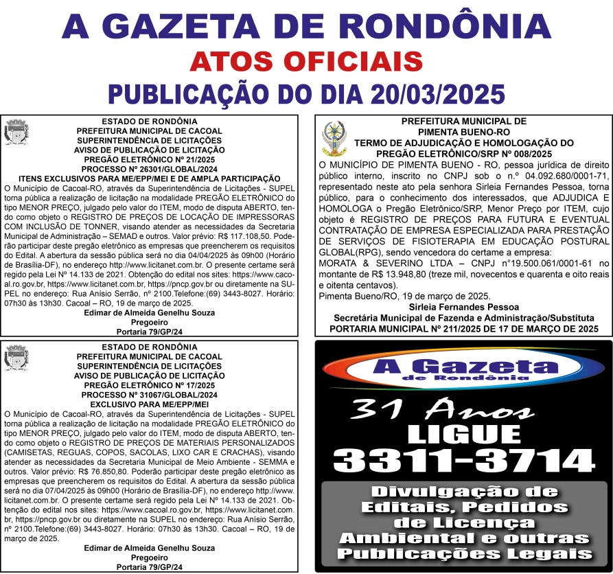 A GAZETA DE RONDÔNIA ATOS OFICIAIS PUBLICAÇÃO DO DIA 20/03/2025 Por Diretor Chefe 19 de março de 2025 às 16h46