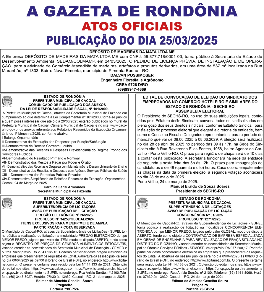 A GAZETA DE RONDÔNIA ATOS OFICIAIS PUBLICAÇÃO DO DIA 25/03/2025 Por Diretor Chefe 25 de março de 2025 às 11h12