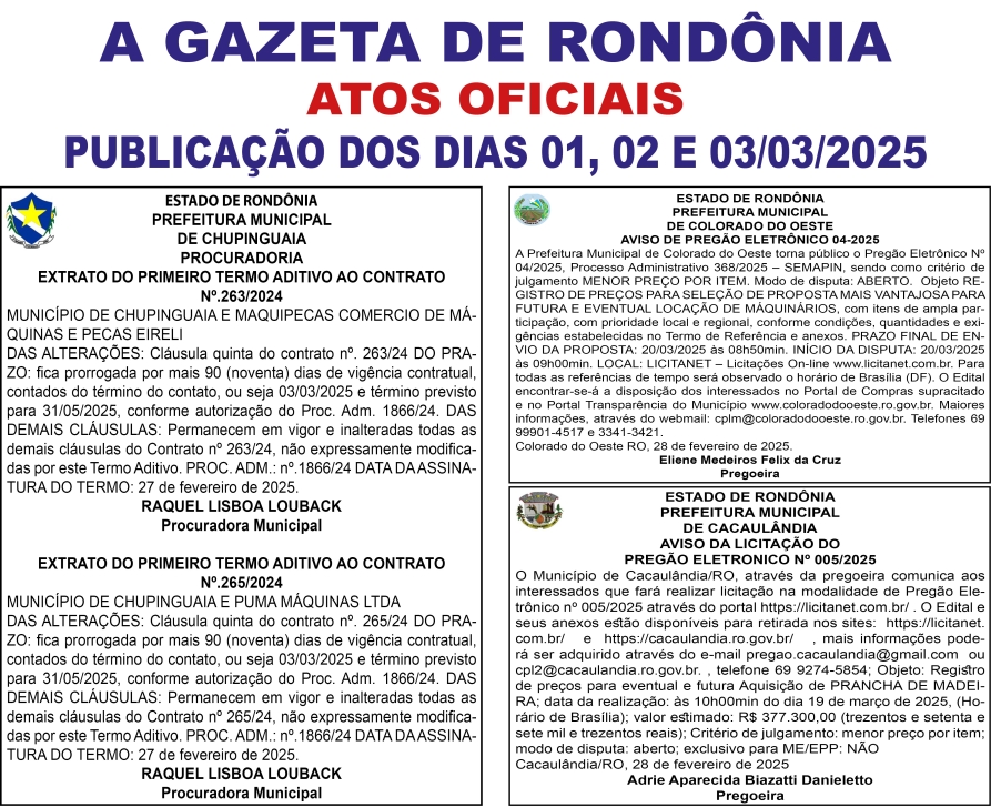 A GAZETA DE RONDÔNIA ATOS OFICIAIS PUBLICAÇÃO DOS DIAS 01, 02 E 03/03/2025 Por Diretor Chefe 28 de fevereiro de 2025 às 16h45