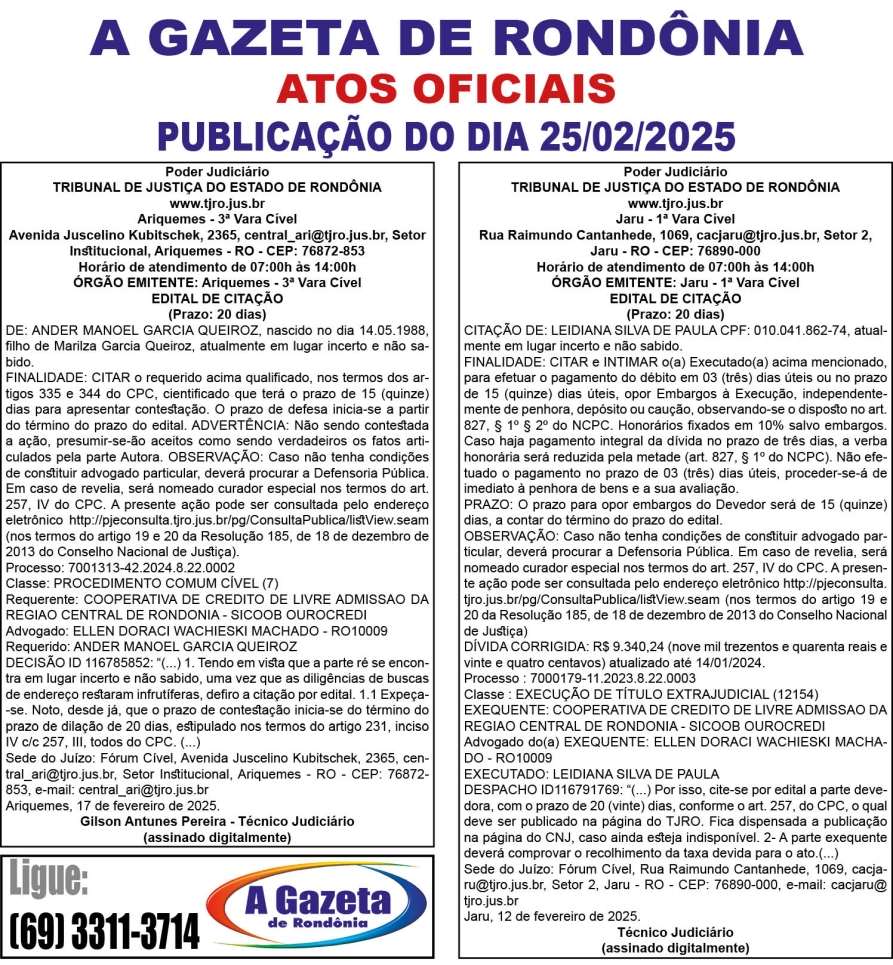 A GAZETA DE RONDÔNIA ATOS OFICIAIS PUBLICAÇÃO DO DIA 25/02/2025 Por Diretor Chefe 24 de fevereiro de 2025 às 18h52