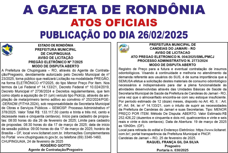 A GAZETA DE RONDÔNIA ATOS OFICIAIS PUBLICAÇÃO DO DIA 26/02/2025 Por Diretor Chefe 25 de fevereiro de 2025 às 16h31