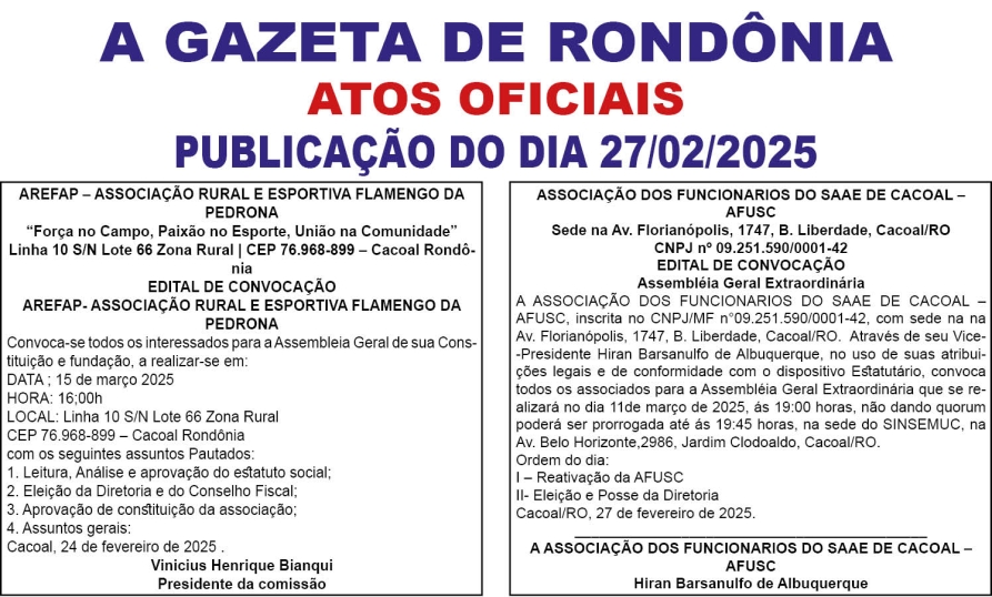A GAZETA DE RONDÔNIA ATOS OFICIAIS PUBLICAÇÃO DO DIA 27/02/2025 Por Diretor Chefe 26 de fevereiro de 2025 às 18h26