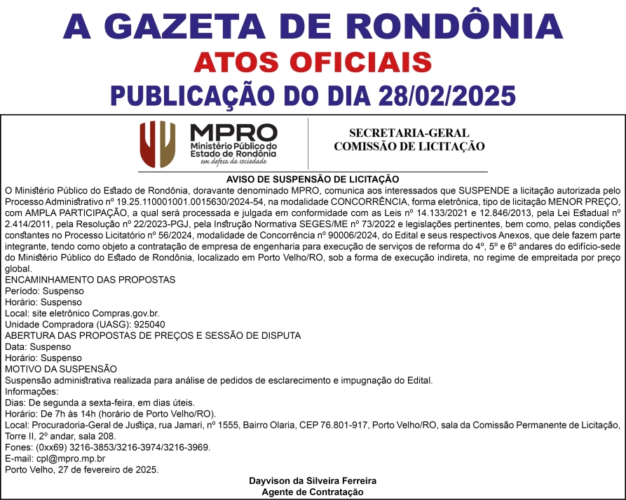 A GAZETA DE RONDÔNIA ATOS OFICIAIS PUBLICAÇÃO DO DIA 28/02/2025 Por Diretor Chefe 27 de fevereiro de 2025 às 16h44