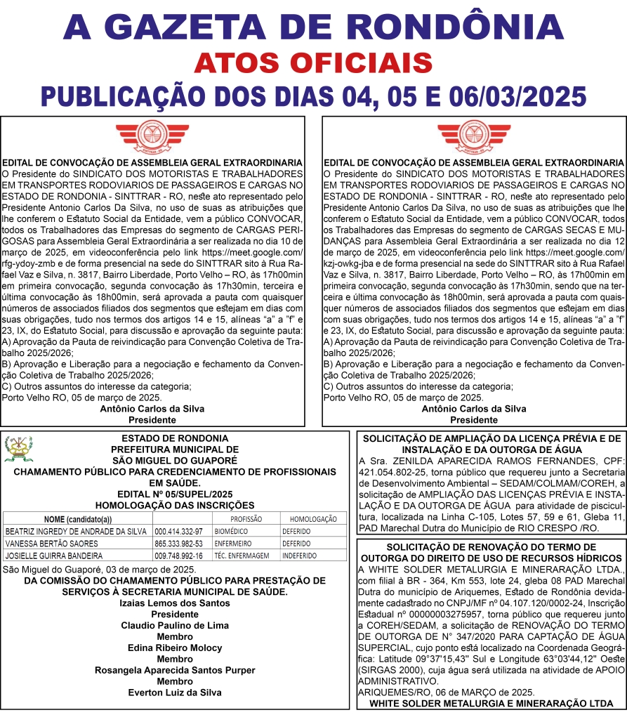 A GAZETA DE RONDÔNIA ATOS OFICIAIS PUBLICAÇÃO DOS DIAS 04, 05 E 06/03/2025 Por Diretor Chefe 5 de março de 2025 às 16h40
