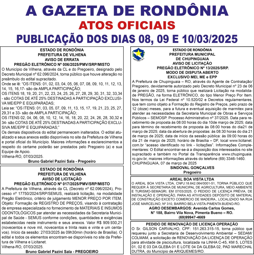A GAZETA DE RONDÔNIA ATOS OFICIAIS PUBLICAÇÃO DOS DIAS 08, 09 E 10/03/2025 Por Diretor Chefe 10 de março de 2025 às 04h47