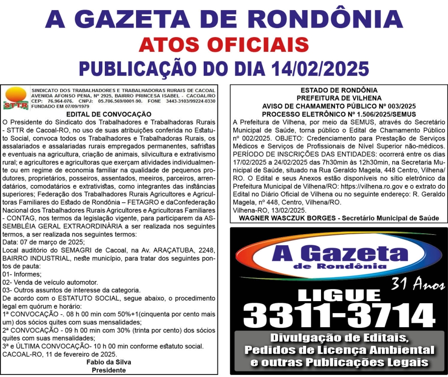 A GAZETA DE RONDÔNIA ATOS OFICIAIS PUBLICAÇÃO DO DIA 14/02/2025 Por Diretor Chefe 13 de fevereiro de 2025 às 16h24