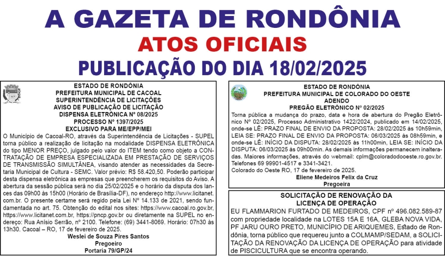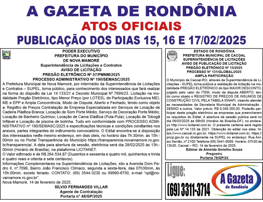 A GAZETA DE RONDÔNIA ATOS OFICIAIS PUBLICAÇÃO DOS DIAS 15, 16 E 17/02/2025 Por Diretor Chefe 14 de fevereiro de 2025 às 17h02